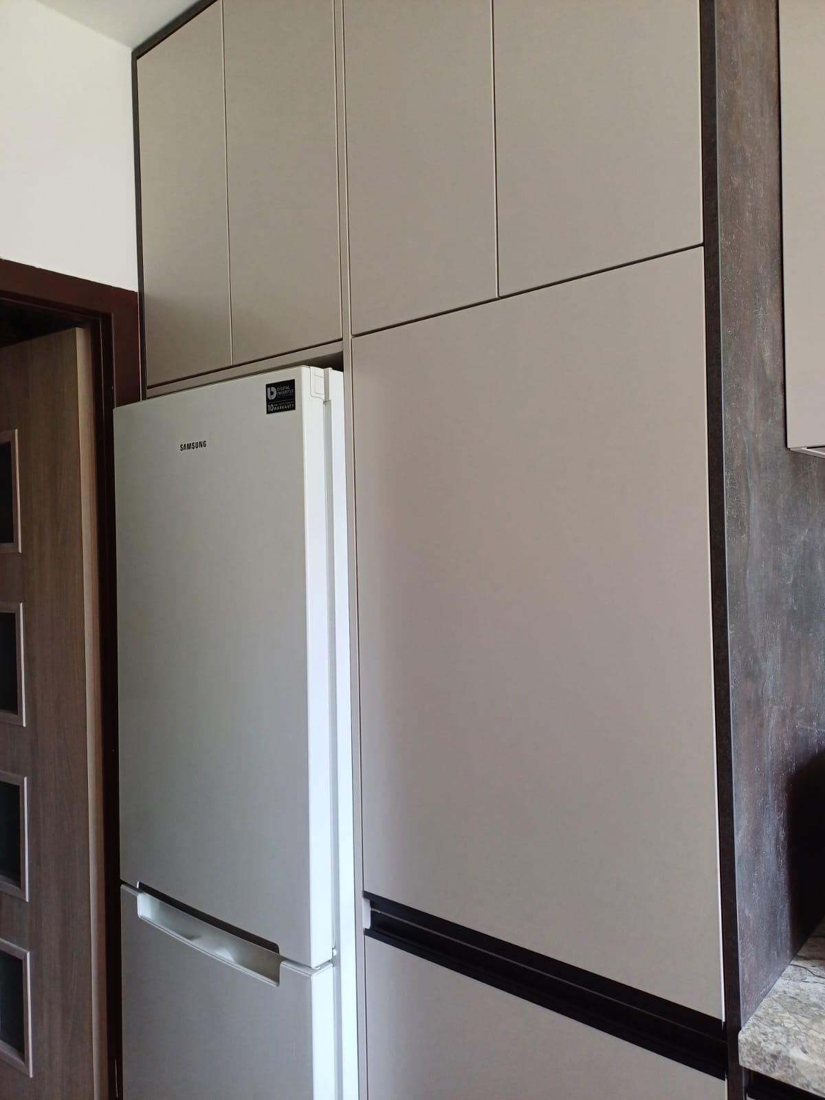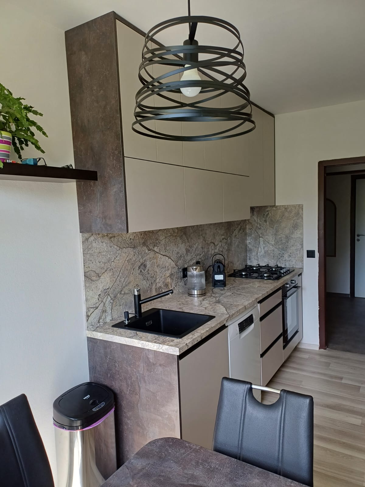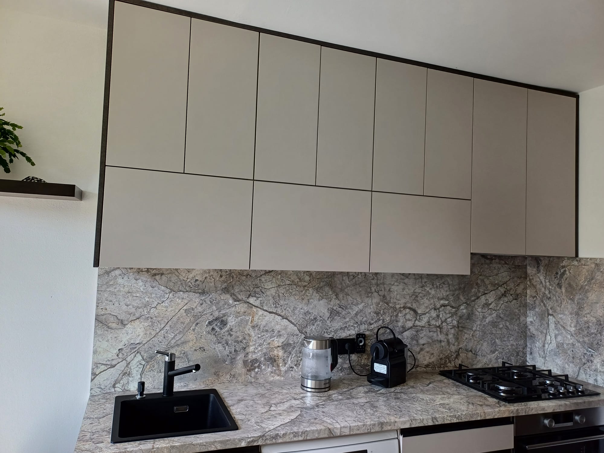 Kuchyň v Teplicích kombinuje elegantní design s praktickými prvky. Každý detail je pečlivě promyšlený, aby poskytoval maximální komfort a estetiku.Korpusy a dvířka této kuchyně jsou provedeny v teplém odstínu Kašmír, který dodává prostoru útulnost a klid. Pohledové boky a jídelní stůl jsou pak zhotoveny v moderním provedení Dark Atelier, které přináší do prostoru eleganci a charakter.Pracovní deska a obkladový panel jsou vyrobeny z materiálu Nebula, který zajišťuje odolnost a snadnou údržbu, aniž by se ztratila jejich estetická hodnota. Tato kombinace materiálů vytváří harmonický celek, který působí moderně a vkusně zároveň.Černé doplňky, včetně zafrézovaného osvětlení, otvíracích profilů a zásuvek, dodávají kuchyni šmrnc a dokreslují její design. Část horních skříněk je vybavena otevíráním Tip On bez úchytkového systému, což zajišťuje jednoduchou a plynulou manipulaci a dodává kuchyni moderní vzhled.Tato kuchyně není pouze místem pro vaření, ale je to prostor, který spojuje estetiku s funkcionalitou a nabízí ideální prostředí pro společné chvíle a vaření s láskou.