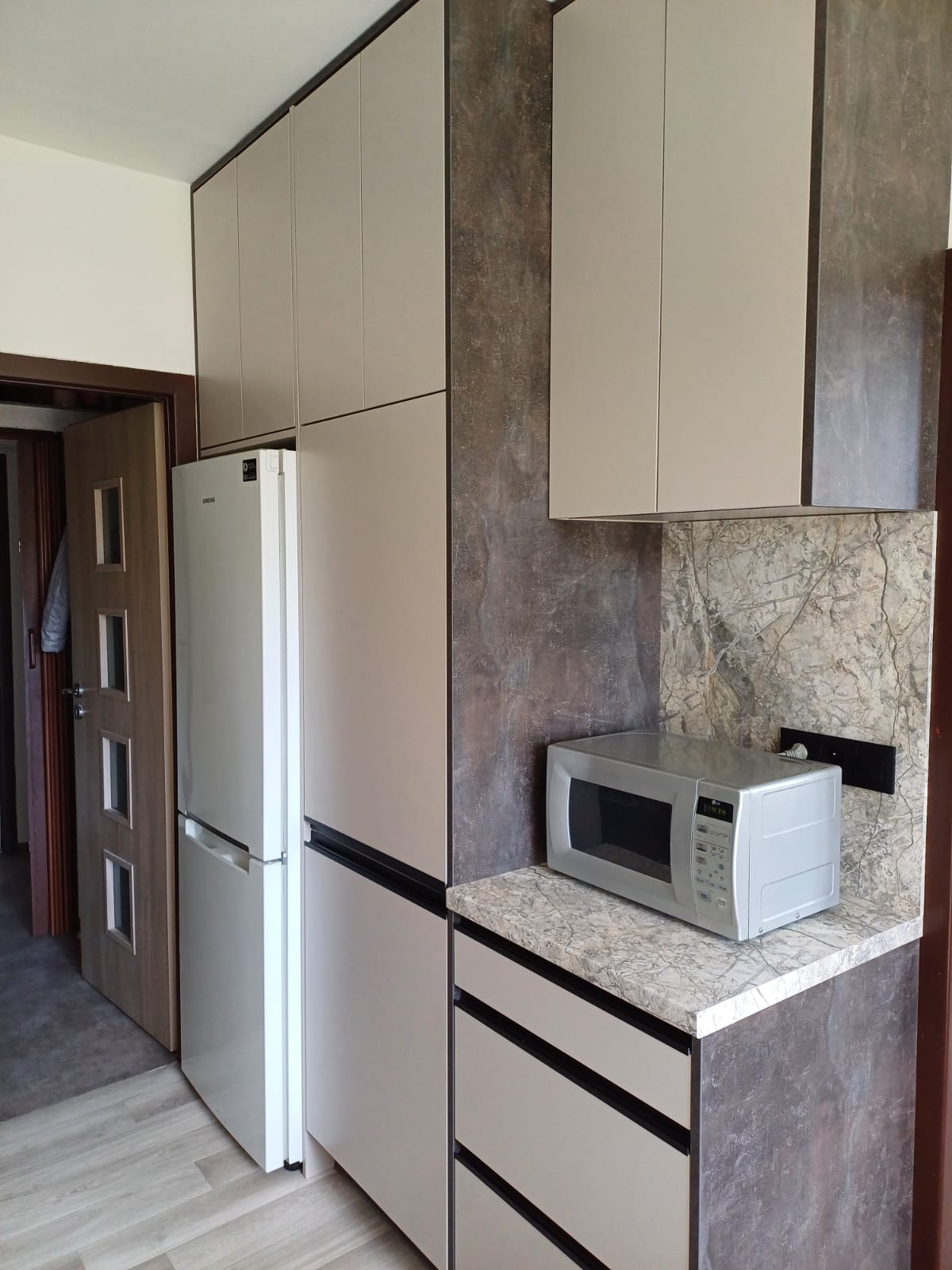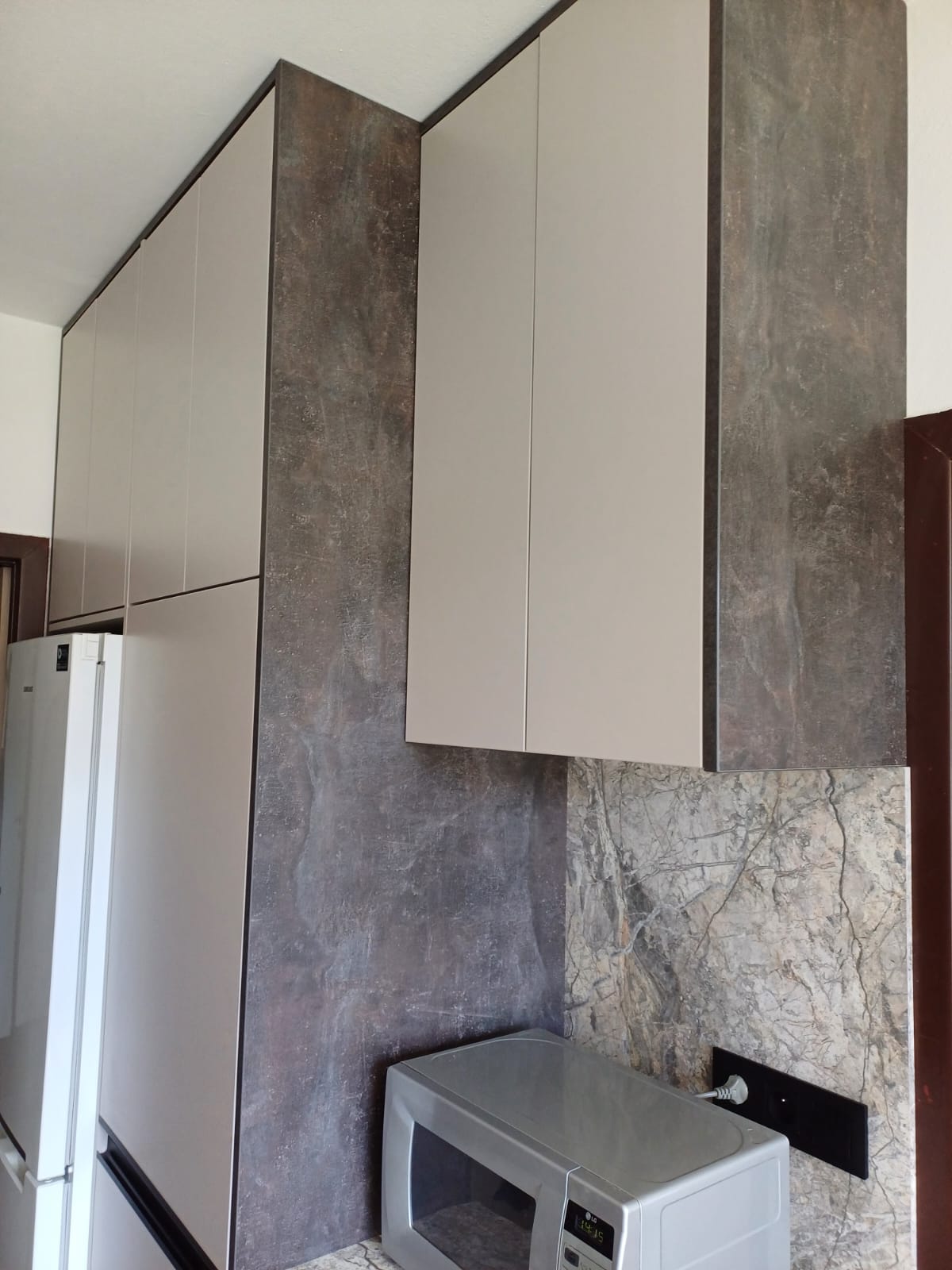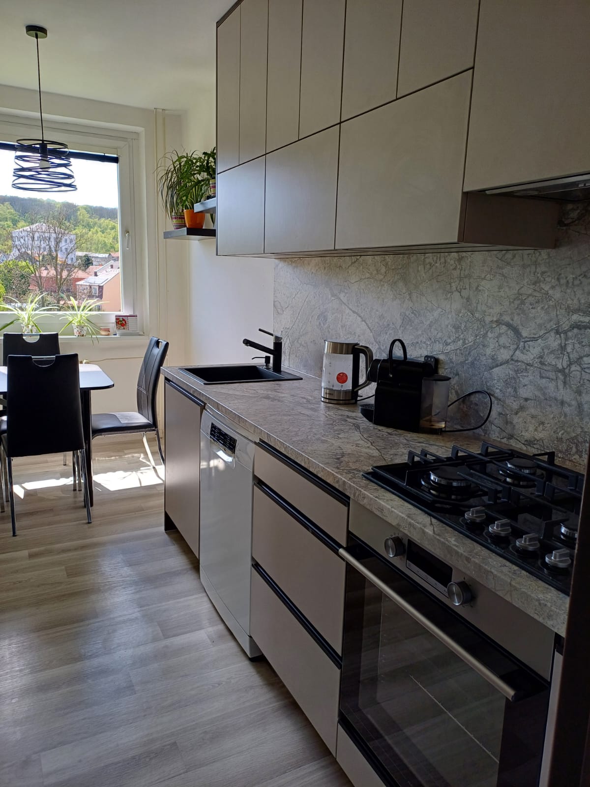 Kuchyň v Teplicích kombinuje elegantní design s praktickými prvky. Každý detail je pečlivě promyšlený, aby poskytoval maximální komfort a estetiku.Korpusy a dvířka této kuchyně jsou provedeny v teplém odstínu Kašmír, který dodává prostoru útulnost a klid. Pohledové boky a jídelní stůl jsou pak zhotoveny v moderním provedení Dark Atelier, které přináší do prostoru eleganci a charakter.Pracovní deska a obkladový panel jsou vyrobeny z materiálu Nebula, který zajišťuje odolnost a snadnou údržbu, aniž by se ztratila jejich estetická hodnota. Tato kombinace materiálů vytváří harmonický celek, který působí moderně a vkusně zároveň.Černé doplňky, včetně zafrézovaného osvětlení, otvíracích profilů a zásuvek, dodávají kuchyni šmrnc a dokreslují její design. Část horních skříněk je vybavena otevíráním Tip On bez úchytkového systému, což zajišťuje jednoduchou a plynulou manipulaci a dodává kuchyni moderní vzhled.Tato kuchyně není pouze místem pro vaření, ale je to prostor, který spojuje estetiku s funkcionalitou a nabízí ideální prostředí pro společné chvíle a vaření s láskou.