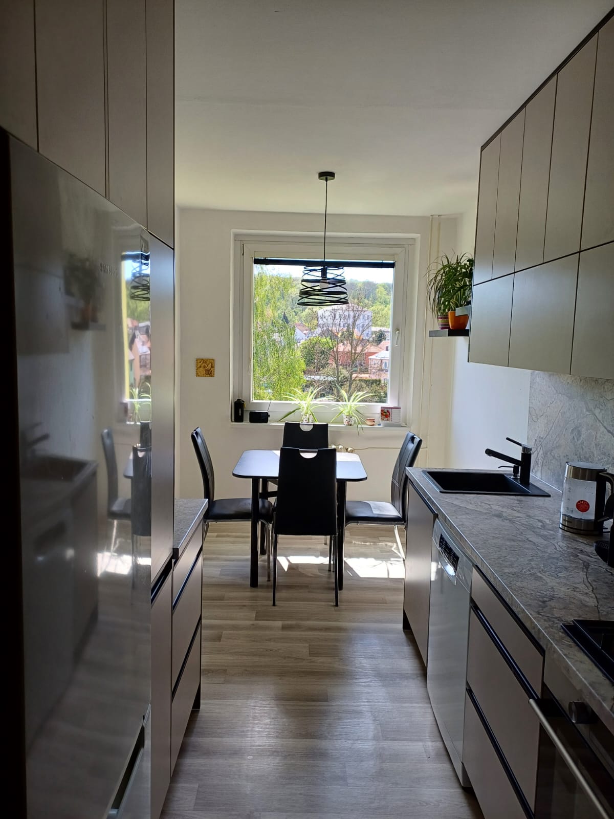 Kuchyň na Zelném trhu v Brně představuje dokonalou kombinaci elegance a funkčnosti. Dvířka v dekoru dřeva dodávají prostoru přírodní teplo, zatímco spíž vedle trouby a mikrovlnné trouby y v bílém lesku vytváří moderní kontrast a opticky zvětšuje prostor. Kuchyňská deska s mramorovým dekorem, dlouhá 4 metry, je nejen esteticky přitažlivá, ale také praktická, ideální pro přípravu jídel. Sklokeramická deska a chromová baterie dodávají celkovému designu sofistikovaný nádech a zajišťují pohodlné vaření v příjemné atmosféře. Tato kuchyň je tak nejen místem pro vaření, ale i srdcem domova, kde se rodí společné chvíle a nezapomenutelné zážitky.