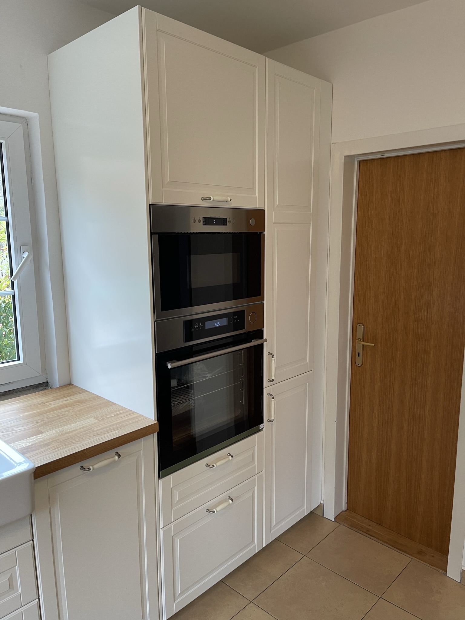 Tato krémová kuchyně nabízí kombinaci elegance a funkčnosti, která osloví každého milovníka stylového domova.Hlavním prvkem této kuchyně je dyhovaná dubová pracovní deska, která přináší do prostoru příjemný přírodní prvek a zajišťuje odolnost a trvanlivost. Atypické řešení šikmého rohu přidává kuchyni neotřelý a moderní vzhled, který zaujme každého návštěvníka.Nižší varianta stupínku přináší do kuchyně praktické řešení pro snadný přístup ke všem částem prostoru a zároveň optimalizuje využití dostupného místa.Kuchyň IKEA s provedením Bodbyn je ideální volbou pro ty, kteří ocení spojení tradičního designu s moderními prvky a hledají kuchyň, která bude nejen stylová, ale také praktická a pohodlná pro každodenní použití.